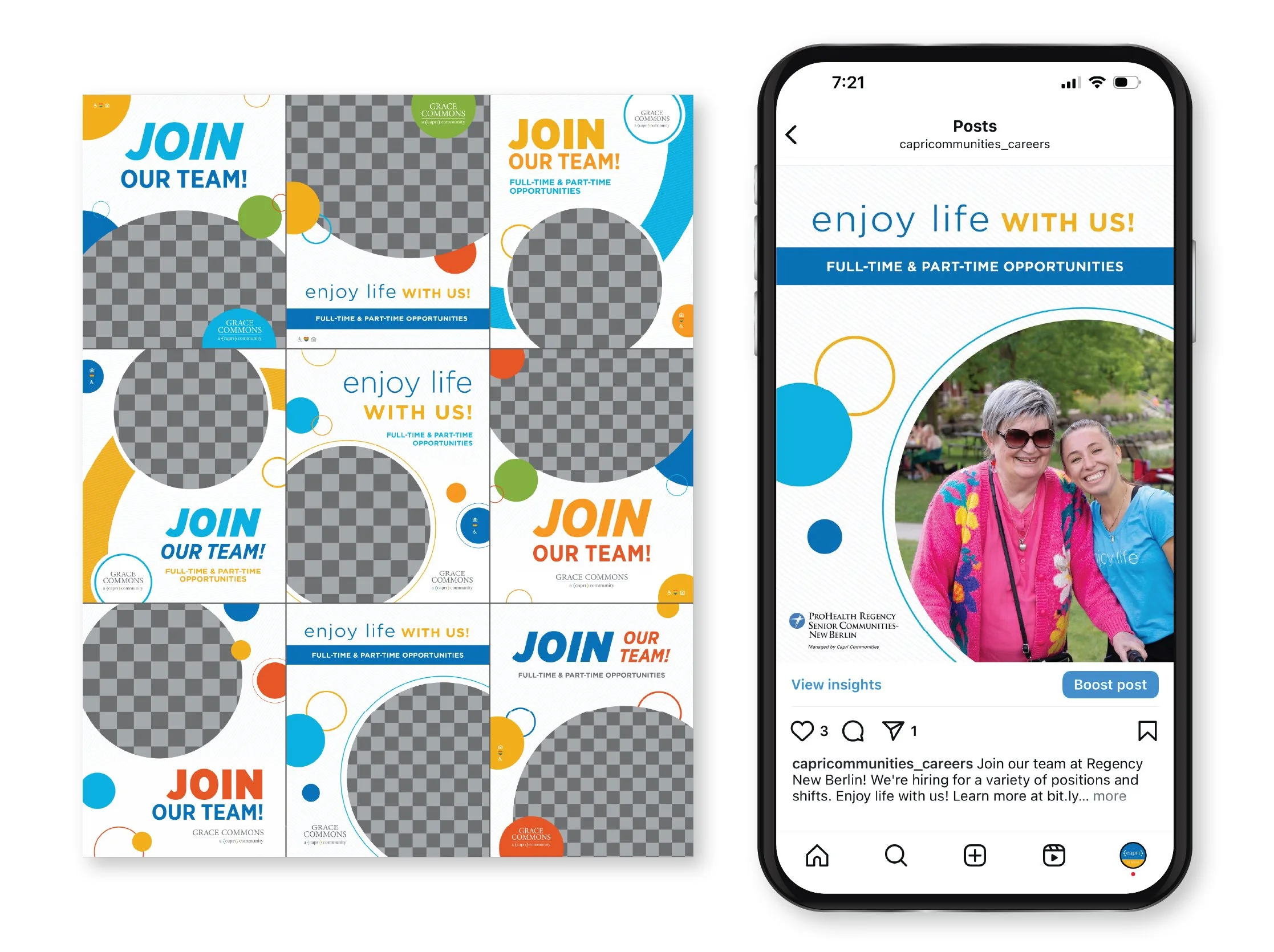 Due to Covid-19, hiring healthcare workers became especially challenging. To support HR initiatives and improve recruitment, we created dedicated Facebook and Instagram accounts to promote job openings and careers at our communities. I manage monthly ad campaigns that spotlight different communities based on their current hiring needs. I meet regularly with the HR team to discuss ongoing initiatives, review staffing priorities, and ensure we’re supporting the communities that need help filling positions. I designed job post templates to maintain consistency across our social media content and make it easy to quickly create posts when urgent hiring needs come up.